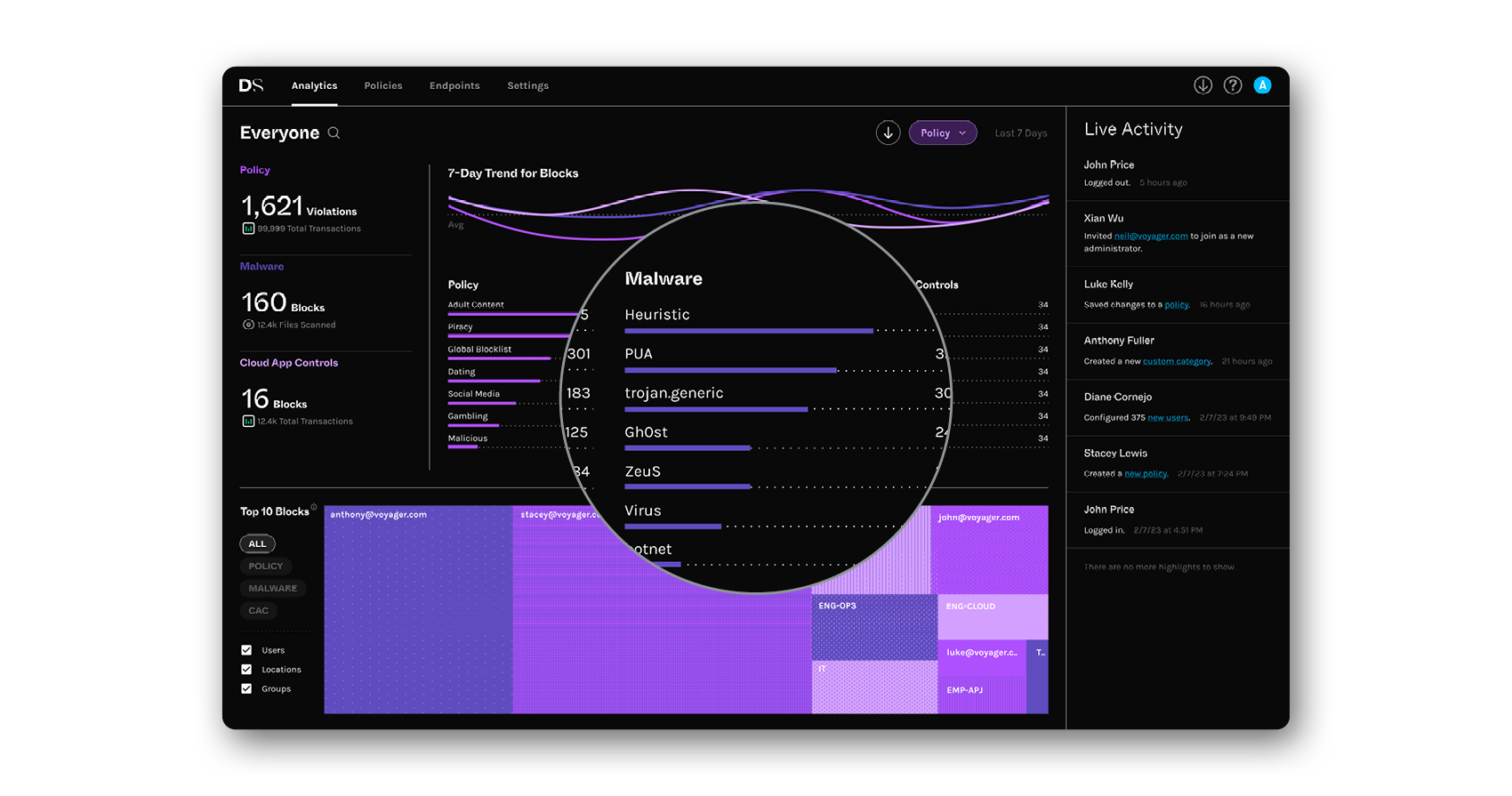 The Policy view shows you details of what policy violations, malware blocks, and cloud app blocks have occurred in the last 7 days across your organization.